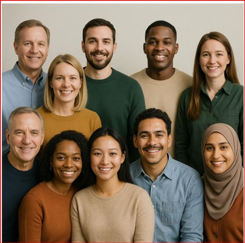 For comparison, I ran the same prompt through ChatGPT 5.0. The output more closely matched Census proportions but still needed adjustments, with the final image below. When asked, the system explained that image models might prioritize visual diversity unless given very specific demographic instructions.